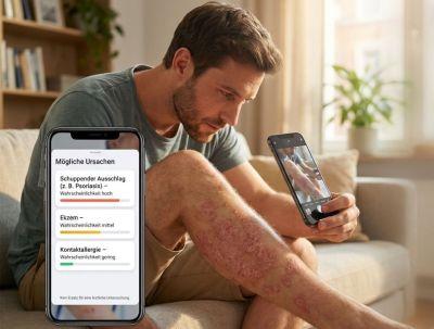 Autoderm analysiert Hautveränderungen anhand eines Smartphone-Fotos und liefert innerhalb von Sekunden eine strukturierte Einschätzung. Die KI benennt die fünf wahrscheinlichsten Diagnosen aus einem Spektrum von 73 häufigen Hauterkrankungen – von Ekzemen über Psoriasis, bakterielle Infektionen bis hin zu Tumoren und genitalen Dermatosen. Die Ausgabe erfolgt in drei Risikostufen und mit einem Handlungsvorschlag: Abwarten, Selbstmedikation oder ärztlicher Besuch.