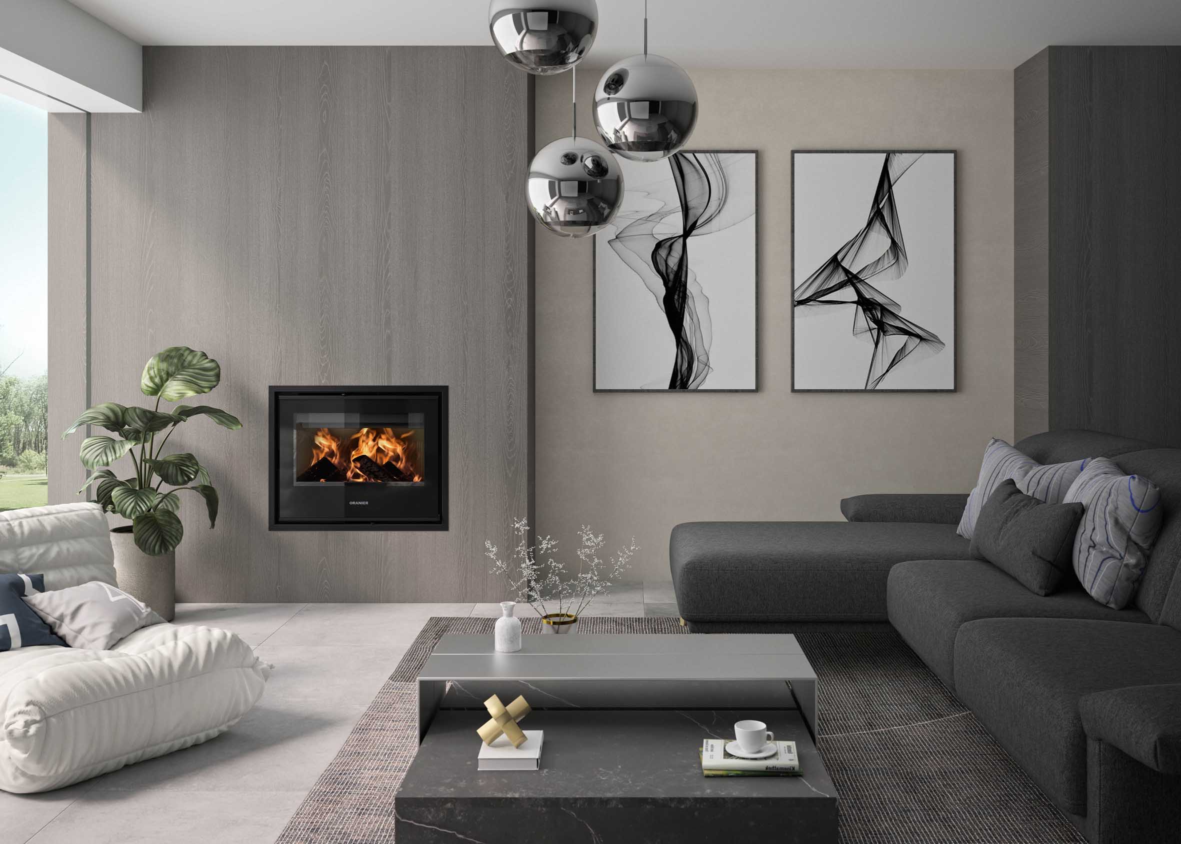 Ob in 70 oder 100 Zentimetern Breite – beide Varianten bieten mit 6,5 bzw. 9 kW Heizleistung viel Wärme für große Räume. Sie lassen sich mit Holzscheiten von bis zu 50 Zentimetern Länge bestücken. Hinter der großzügigen Panoramascheibe entfachen die Flammen ihre volle Wirkung. Die Auskleidung mit weißem Feuerbeton, die im schlichtem Schwarz eingefasste Panoramascheibe und der schmale Türrahmen mit versenkbaren Griff unterstreichen das minimalistische Erscheinungsbild. Zwei besonders leise Ventilatoren verteilen die Wärme gleichmäßig im Raum und sorgen für ein komfortables Wohngefühl.