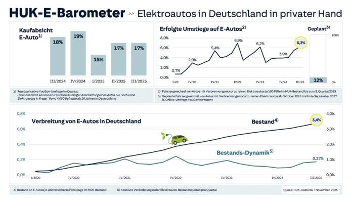 Die Häufigkeit, mit der die Deutschen privat von Autos mit Verbrennungsmotor zu reinen Elektroautos wechseln, hat im dritten Quartal 2025 den höchsten Wert seit zwei Jahren erreicht. Laut HUK-E-Barometer fand der Umstieg bei 6,2 Prozent aller privaten Fahrzeugwechsel (Vorquartal 5,5 %) statt. Die Umstiegshäufigkeit hat sich damit seit dem Tiefpunkt Anfang 2024, also nach Wegfall der staatlichen E-Kaufprämie, mehr als verdoppelt. Am begehrtesten waren im bisherigen Jahresverlauf der Skoda Elroq bei Neuwagen und der VW ID.3 bei Gebrauchten. Eine für 2026 neu konzipierte staatliche E-Auto-Förderung könnte zudem Wirkung entfalten: Werden hiermit auch gebrauchte und damit erschwinglichere E-Autos gefördert, sollte dies insbesondere die Altersgruppe unter 40 Jahren aktivieren. Denn hier sind rein elektrisch betriebene Fahrzeuge laut HUK-E-Barometer weit beliebter als unter Älteren. Bisher aber waren – vermutlich wegen hoher Preise – die Umstiege auf E-Autos in dieser jüngeren Altersgruppe vergleichsweise selten. Auch Hybrid-Fahrzeuge spielen eine Rolle für das künftige Umstiegstempo. Jedoch: Nur bei Fahrern von Plug-In-Hybriden gibt es bislang signifikant mehr spätere Wechsel zu reinen E-Autos.