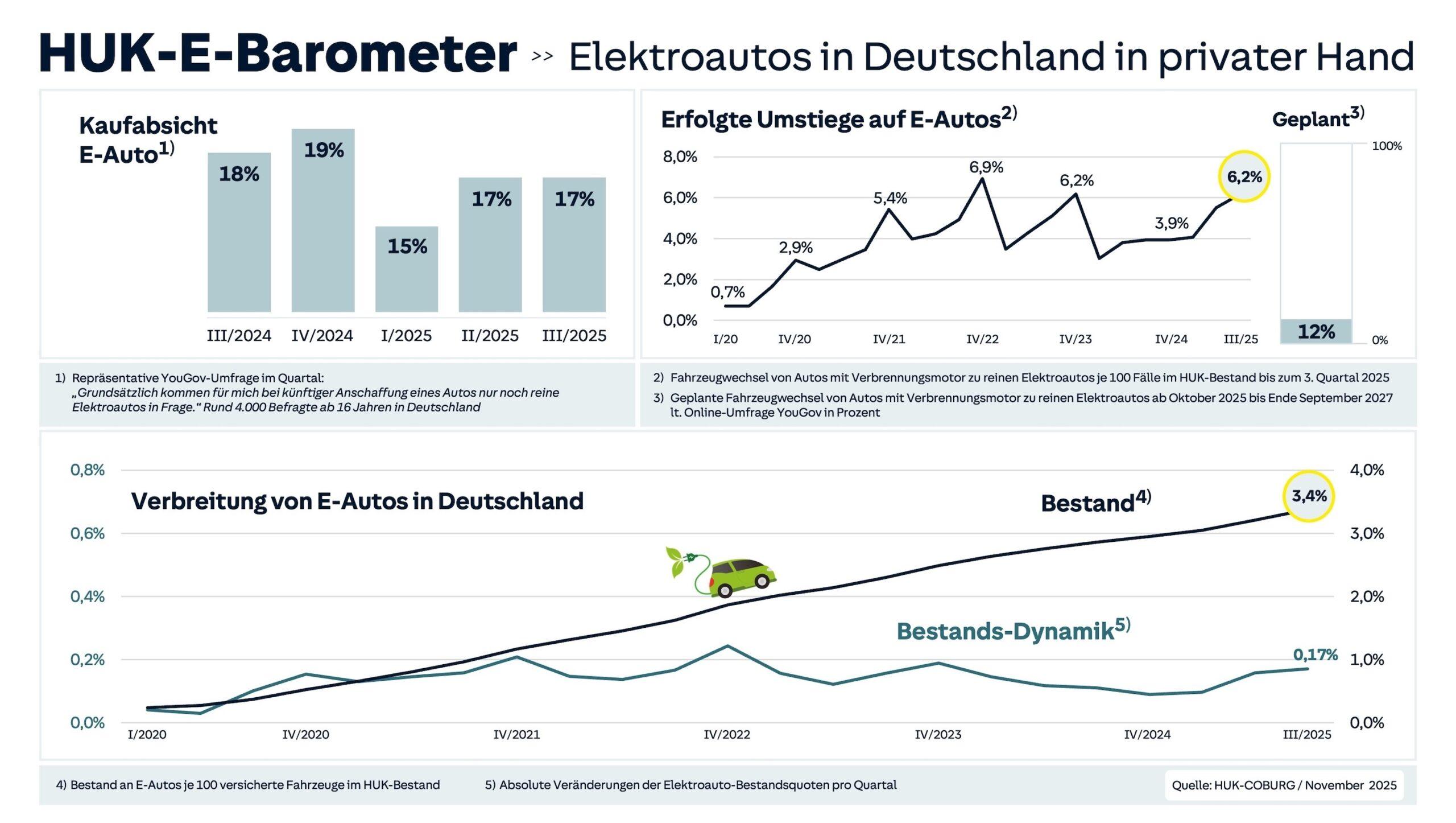 Das sind zentrale Ergebnisse des HUK-E-Barometers, die sich aus dem Versicherungs-bestand des marktführenden Unternehmens ergeben sowie aus parallel laufenden bundesweit repräsentativen Befragungen. Dr. Jörg Rheinländer, im Vorstand der HUK-COBURG zuständig für die Kfz-Versicherung: „Ein neuer Schub bei der Verbreitung von Elektroautos in Deutschland scheint jetzt da zu sein. Und die Pläne der Bundesregierung für eine neu konzipierte Förderung ab 2026 gehen aus unserer Sicht in die richtige Richtung.“