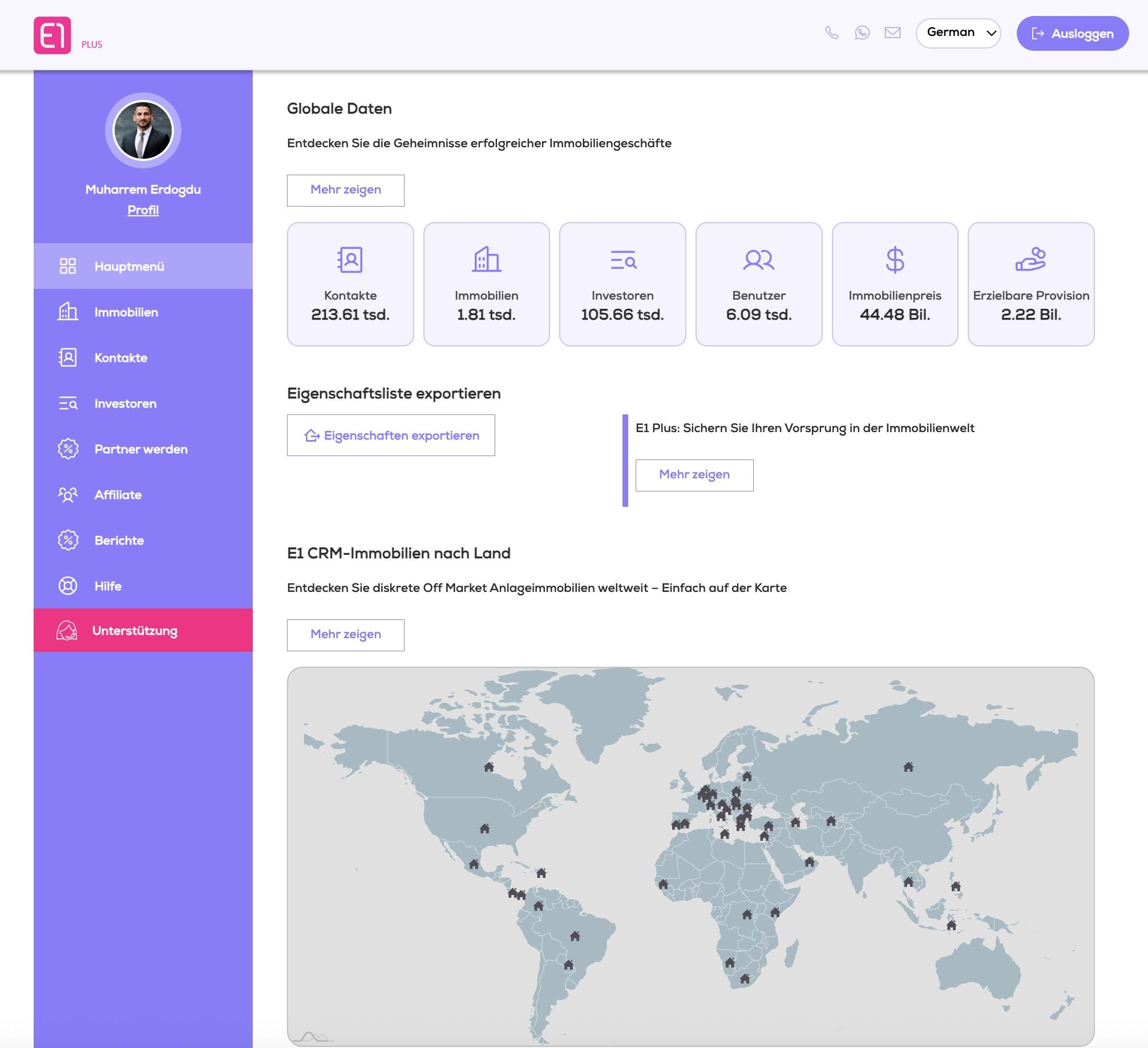 Mit einem Netzwerk von über 5.500 Transaktionsmanagern weltweit und der digitalen Plattform E1 Plus verbindet E1 Holding Investoren, Eigentümer und Makler diskret und effizient. Die Plattform ermöglicht den direkten Zugang zu geprüften Anlageimmobilien, Beteiligungen und internationalen Projekten – fernab der öffentlichen Portale.