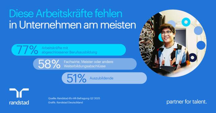 Eschborn, August 2025 – Der Mangel an qualifizierten Fachkräften bleibt eine der größten Herausforderungen für Unternehmen in Deutschland. Das zeigt die aktuelle Randstad-ifo-HR-Befragung für das zweite Quartal 2025. Besonders betroffen sind Betriebe auf der Suche nach Mitarbeitenden mit abgeschlossener Berufsausbildung: 77 % der befragten Unternehmen geben an, hier einen sehr starken bzw. eher starken Mangel zu spüren.