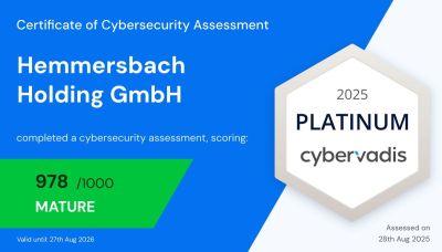 Hemmersbach erhält die CyberVadis-Platin-Medaille 2025 für herausragende Cybersicherheit mit 978 von 1.000 Punkten – und zählt damit zu den Top 1 % der weltweit bewerteten Unternehmen.