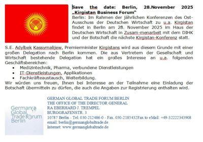 S.E. Adylbek Kassymalijew, Premierminister Kirgistans wird auch aus diesem Grunde mit einer großen Delegation nach Berlin kommen. Die aus Vertretern der Gesellschaft und Wirtschaft bestehende Delegation hat ein großes Interesse an u.a. folgenden Geschäftsbereichen: Medizintechnik, Pharma, verbundene Dienstleistungen, IT-Dienstleistungen, Applikationen, Fachkräfteaustausch, Produktionstechnologien und Weiterbildung.
