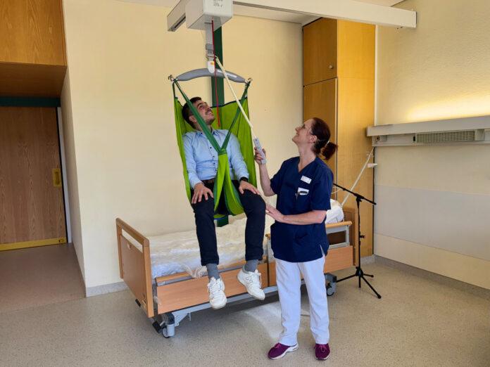 Im Rahmen eines Rundgangs durch das Haus besichtigten die Besucherinnen und Besucher die Räumlichkeiten des MMK sowie ein speziell ausgestattetes Patientenzimmer für Menschen mit Conterganschädigung. Rummelsberg verfügt aktuell über zwei solcher Zimmer, die mit besonderen Hilfsmitteln wie einem an der Zimmerdecke angebrachten Patientenlifter, einem Dusch-WC, Fensteröffner und Anziehhaken an der Wand ausgestattet sind. „Mit den Mitteln der Stiftung konnten hier modernste Hilfsmittel angeschafft werden, die Patientinnen und Patienten mit Conterganschädigung den stationären Aufenthalt erleichtern und zur Wohlfühlqualität erheblich beitragen“, lobte Margit Hudelmaier, Vorständin und Vorsitzende des Landesverbandes Baden-Württembergs.