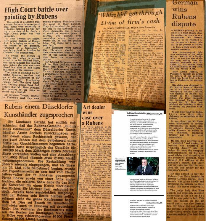 „Ein Londoner Gericht hat entschieden, daß das Rubens-Gemälde „Bildnis eines Edelmanns“ dem Düsseldorfer Kunsthändler Armin Jockels zurückzugeben sei… Der Richter entschied, Jockels habe ausdrücklich festgelegt, daß der Rubens sein Besitz bleiben sollte, solange nicht die ganze Kaufsumme beglichen ist.“