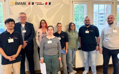 In der Unternehmenszentrale in Langenselbold arbeiteten zwei Mitarbeiterinnen des Behindertenwerks Main-Kinzig (BWMK) einen Tag lang im Büro von secura protect mit. Parallel besuchte ein Mitarbeitender und zwei kaufmännische Auszubildende von secura protect das Dienstleistungszentrum des BWMK und lernten dort verschiedene Tätigkeitsbereiche kennen – vom Recycling über Aktenvernichtung bis zur Warenannahme.