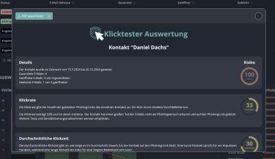 Die aktuelle Bedrohungslage zeigt, dass klassische Sicherheitsmaßnahmen allein nicht mehr ausreichen. Täglich kommen neue Angriffe ans Licht. Angreifer setzen gezielt auf menschliche Faktoren und entwickeln ihre Methoden kontinuierlich weiter. Klicktester unterstützt Unternehmen dabei, die Belegschaft gezielt zu sensibilisieren. Über die Plattform lassen sich realitätsnahe Szenarien durchführen, deren Ergebnisse sofortige Rückschlüsse auf Schwachstellen ermöglichen.