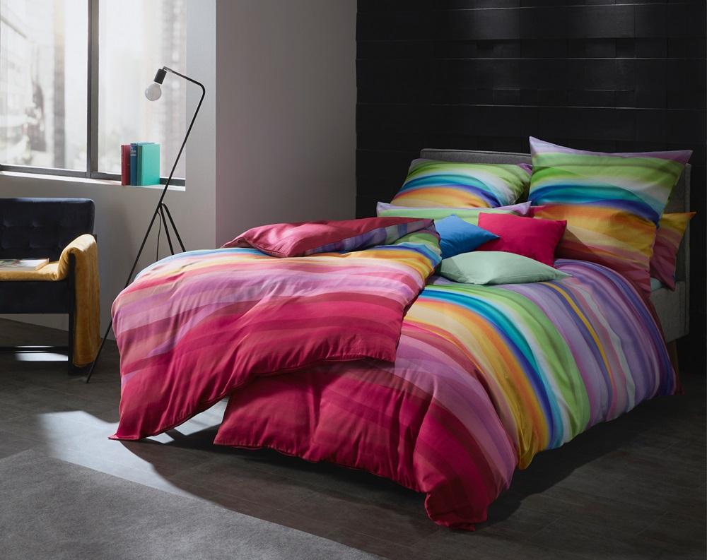 Mit der Bettwäsche „Ansbach“ zeigt erwinmueller.de, wie sich weiche, elastische Materialien harmonisch in gedeckte Erdtonpaletten einfügen. Ganz anders wirkt die Mako-Satin-Bettwäsche im kräftigen Farbverlauf: Sie setzt ein bewusstes Statement und greift die Akzentfarben der Saison auf.