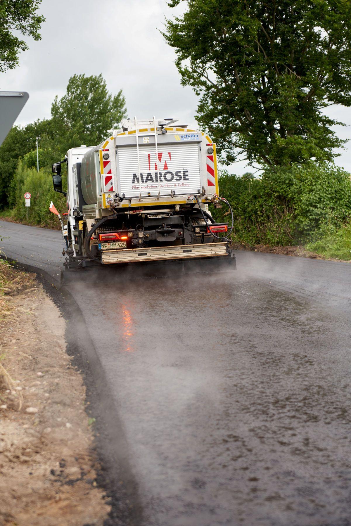 Als gelernter Straßenbaumeister ist Marose von Fach wie alle seine Mitarbeiter, die ebenfalls aus der Branche kommen. Eine der jüngsten Investitionen ist eine Lkw-Bitumenvorspritzmaschine von schäfer-technic. „Einen eigenen Maschinenpark halte ich für überaus wichtig. Denn nach einem erfolgreichen Angebot und der Vorplanung der Baustelle kann ich so das komplette Geschehen im Baustellenablauf zuverlässig abwickeln. Mietmaschinen und Dienstleister sind nicht immer verfügbar, wenn ich sie brauche,“ erklärt Marcel Marose. So ist es nur konsequent, dass Marose über einen kompletten Maschinenpark für den Asphaltbau verfügt.