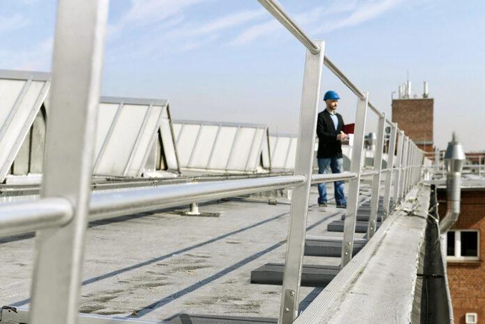 Beim Betreten eines Flachdachs zu Wartungs- oder Reinigungsarbeiten muss eine Absturzsicherung vorhanden sein. Auf Dächern befinden sich immer häufiger Photovoltaik-Module, Klima- oder Lüftungsanlagen, die regelmäßige Inspektionen erfordern. Abstürze aus der Höhe zählen zu den häufigsten Unfallursachen in der Arbeitswelt. Entsprechend schreibt der Gesetzgeber vor, dass Beschäftigte auf Dächern durch geeignete Maßnahmen geschützt werden müssen. Die wirksamste Schutzmaßnahme ist dabei ein festes Geländer entlang der Dachkante. Solche kollektiven Absturzsicherungen haben wann immer möglich Vorrang vor individueller Ausrüstung wie PSAgA.