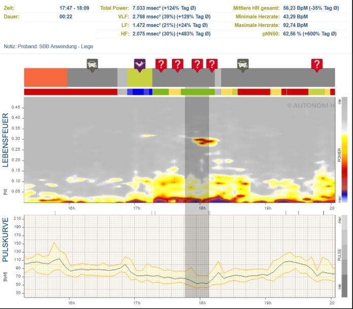 In addition to numerous remarkable testimonials, we now have measurement data that proves a positive effect of subtle body work on the autonomic nervous system: A study was conducted on the effectiveness of Subtle Body Balance by means of heart rate variability (HRV) measurements. The HRV measurement is considered an objective measure of the physical and mental state and shows what is beneficial. Long-term measurements with test subjects have revealed a strengthening of the entire autonomic nervous system. The effect of the Subtle Body Balance treatment shows a strongly pronounced, repeatable pattern in the HRV – an example is shown below. The four question marks on the graph indicate the period of the Subtle Body Balance session: Theory, Exercises, Treatment and Follow-up. The values listed were measured during the treatment on the treatment table.