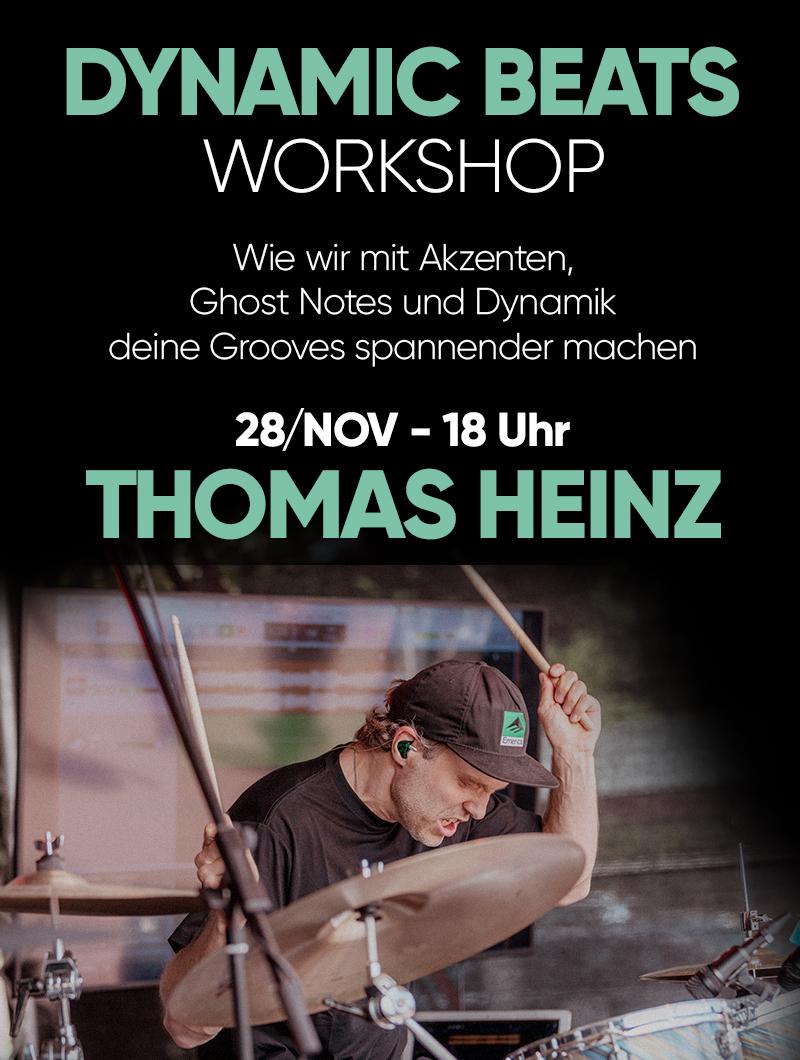 Unter dem Motto „Dynamic Beats“ zeigt Thomas Heinz, wie Akzente, Ghost Notes und Dynamik den Unterschied machen – und wie jeder Drummer seine Grooves durch die bewusste Gestaltung von Lautstärke und Timing lebendiger und musikalischer gestalten kann.